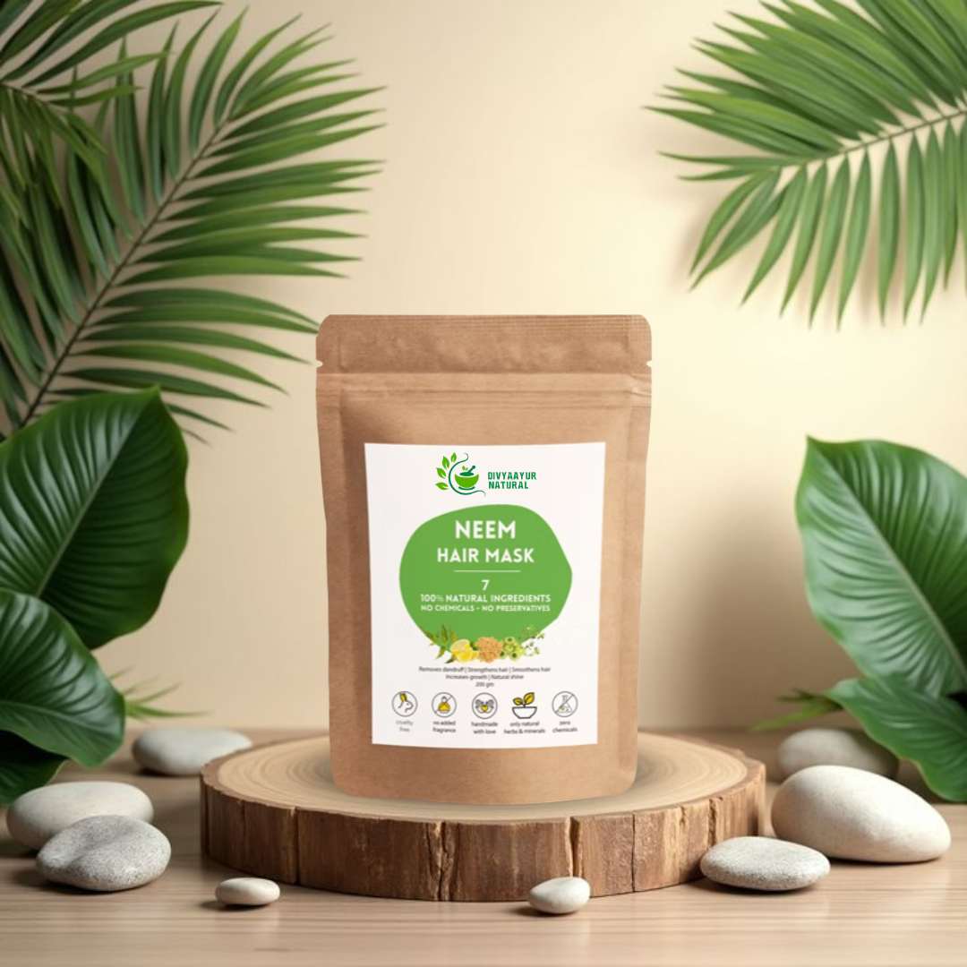 Brahmi & Neem Hair Mask is an Ayurvedic hair treatment enriched with Brahmi and Neem extracts that treat dandruff, nourish the scalp, and promote healthy, strong hair.